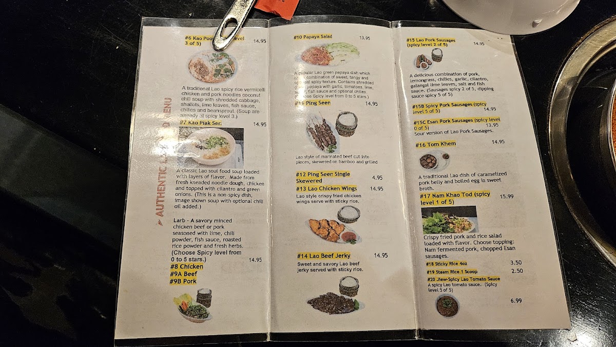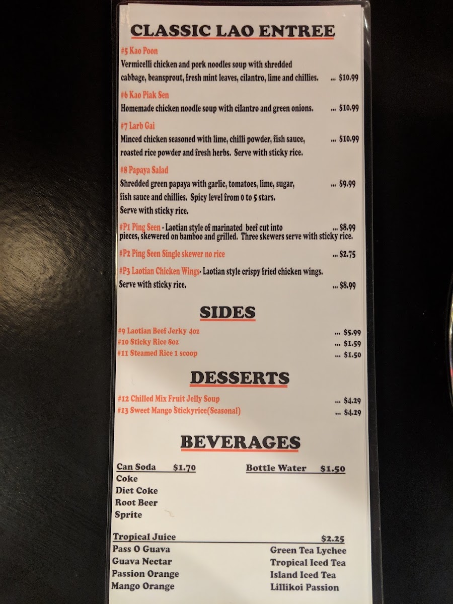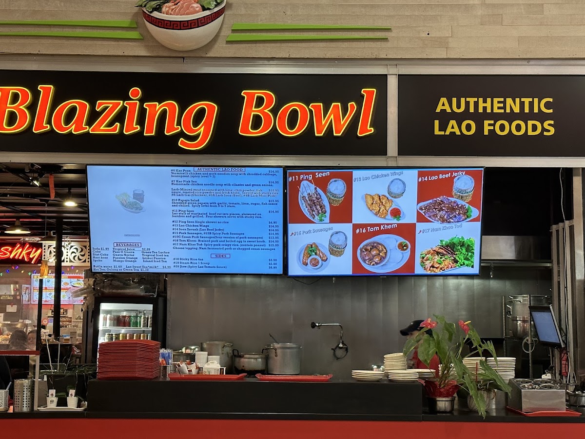 Blazing Bowl offers a variety of flavorful dishes that capture the essence of Laotian cuisine. Their Classic Lao Entrees include the savory Kao Poon for $5 and the comforting Kao Piak Sen for $6, both offering rich, aromatic flavors. For those looking for a heartwarming experience, the Hot Pot Menu features two standout broths: the Simmering Beef Broth and the Laotian Spicy Beef Broth. The richness and spice levels of these broths are perfect for any spice lover. Complementing the main dishes, you can enjoy Pin Seen Single Skewer for $13 or a side of Sticky Rice for $14. No meal is complete without dessert, and Blazing Bowl offers two mouthwatering options: the refreshing Chilled Mix Fruit Jelly Soup and the indulgent Sweet Mango Sticky Rice, both delightful and refreshing. To wash everything down, there are beverages like Tropical Juice and Soda, ensuring a well-rounded dining experience.